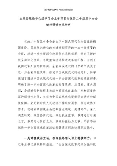 【七哥公文】2024年:在政协理论中心组学习会上学习贯彻党的二十届三中全会精神研讨交流材料+更多免费公文+VX:QiGeGongWen2024