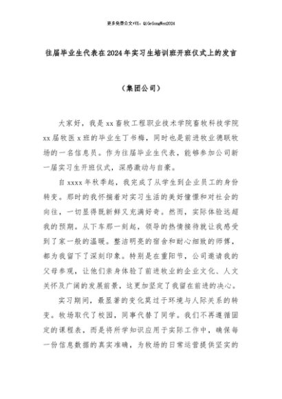 【七哥公文】2024年:往届毕业生代表在2024年实习生培训班开班仪式上的发言(集团公司)+更多免费公文+VX:QiGeGongWen2024