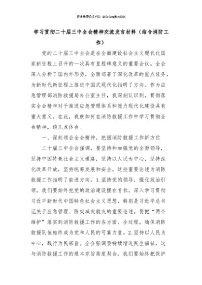 【七哥公文】2024年:学习贯彻二十届三中全会精神交流发言材料(结合消防工作)+更多免费公文+VX:QiGeGongWen2024