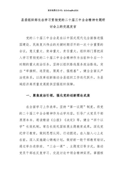 【七哥公文】2024年:县委组织部长在学习贯彻党的二十届三中全会精神专题研讨会上的交流发言+更多免费公文+VX:QiGeGongWen2024