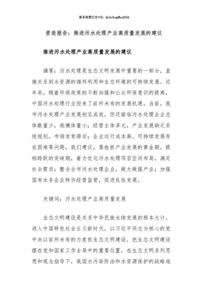 【七哥公文】2024年:资政报告:推进污水处理产业高质量发展的建议+更多免费公文+VX:QiGeGongWen2024