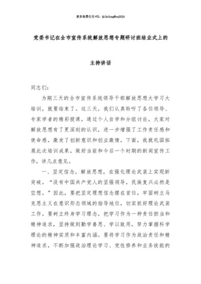 【七哥公文】2024年:党委书记在全市宣传系统解放思想专题研讨班结业式上的主持讲话+更多免费公文+VX:QiGeGongWen2024