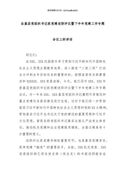 【七哥公文】2024年:在基层党组织书记抓党建述职评议暨下半年党建工作专题会议上的讲话+更多免费公文+VX:QiGeGongWen2024
