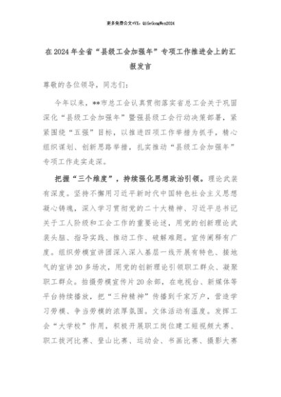 【七哥公文】2024年:在2024年全省“县级工会加强年”专项工作推进会上的汇报发言+更多免费公文+VX:QiGeGongWen2024