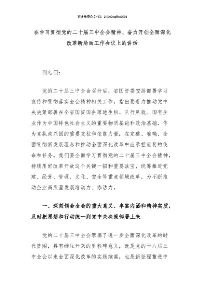 【七哥公文】2024年:在学习贯彻党的二十届三中全会精神、奋力开创全面深化改革新局面工作会议上的讲话+更多免费公文+VX:QiGeGongWen2024