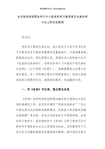 【七哥公文】2024年:在市政协党组理论学习中心组党纪学习教育第五次集体学习会上的发言提纲+更多免费公文+VX:QiGeGongWen2024