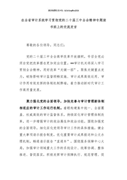 【七哥公文】2024年:在全省审计系统学习贯彻党的二十届三中全会精神专题读书班上的交流发言+更多免费公文+VX:QiGeGongWen2024