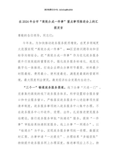 【七哥公文】2024年:在2024年全市“高效办成一件事”重点事项推进会上的汇报发言+更多免费公文+VX:QiGeGongWen2024