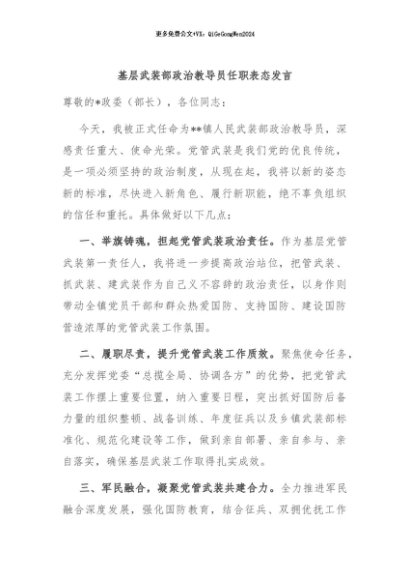 【七哥公文】2024年:基层武装部政治教导员任职表态发言+更多免费公文+VX:QiGeGongWen2024