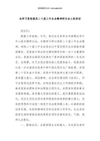 / 【七哥公文】2024年:在学习贯彻落实二十届三中全会精神研讨会上的讲话+更多免费公文+VX:QiGeGongWen2024