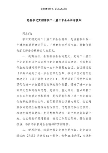 / 【七哥公文】2024年:党委书记贯彻落实二十届三中全会讲话提纲+更多免费公文+VX:QiGeGongWen2024