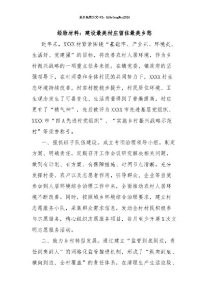 / 【七哥公文】2024年:经验材料:建设最美村庄留住最美乡愁+更多免费公文+VX:QiGeGongWen2024