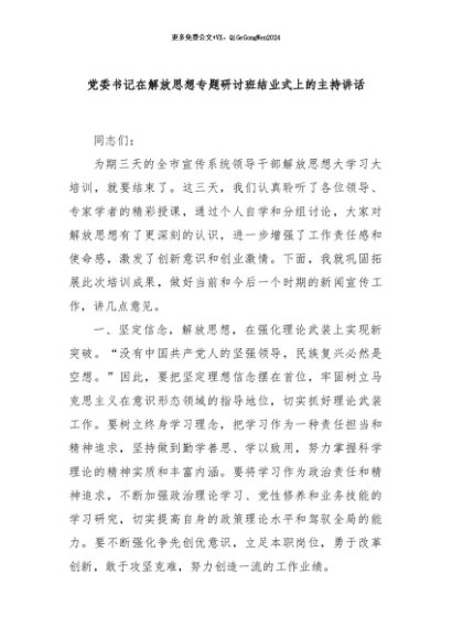 / 【七哥公文】2024年:党委书记在解放思想专题研讨班结业式上的主持讲话+更多免费公文+VX:QiGeGongWen2024
