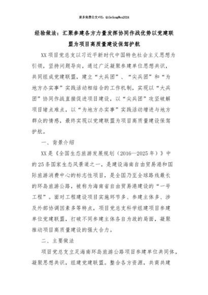 【七哥公文】2024年:经验做法:汇聚参建各方力量发挥协同作战优势以党建联盟为项目高质量建设保驾护航+更多免费公文+VX:QiGeGongWen2024
