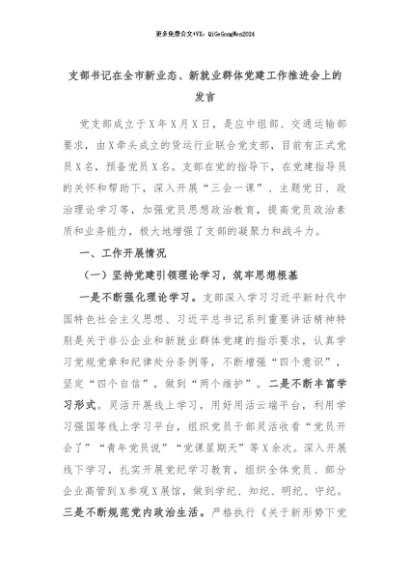 【七哥公文】2024年:支部书记在全市新业态、新就业群体党建工作推进会上的发言+更多免费公文+VX:QiGeGongWen2024
