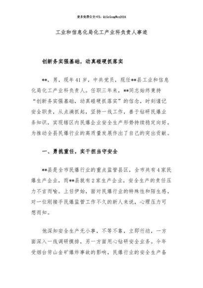 / 【七哥公文】2024年:工业和信息化局化工产业科负责人事迹+更多免费公文+VX:QiGeGongWen2024