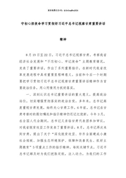 【七哥公文】2024年:守初心担使命学习贯彻好习近平总书记视察甘肃重要讲话精神+更多免费公文+VX:QiGeGongWen2024