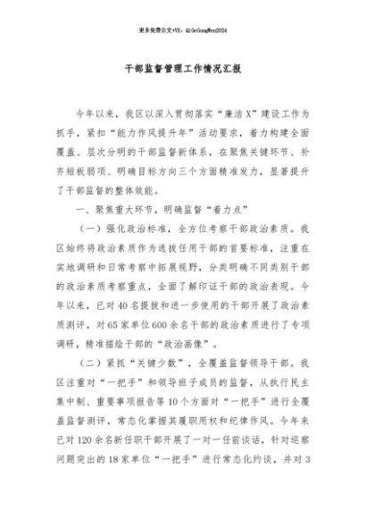 / 【七哥公文】2024年:干部监督管理工作情况汇报+更多免费公文+VX:QiGeGongWen2024