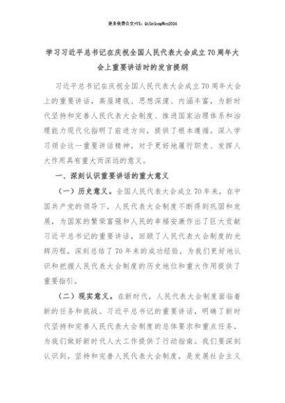 【七哥公文】2024年:学习习近平总书记在庆祝全国人民代表大会成立70周年大会上重要讲话时的发言提纲+更多免费公文+VX:QiGeGongWen2024