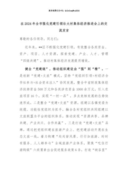 【七哥公文】2024年:在2024年全市强化党建引领壮大村集体经济推进会上的交流发言+更多免费公文+VX:QiGeGongWen2024