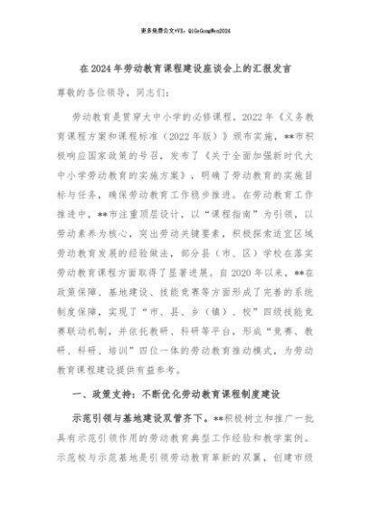 / 【七哥公文】2024年:在2024年劳动教育课程建设座谈会上的汇报发言+更多免费公文+VX:QiGeGongWen2024