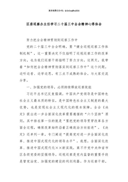 / 【七哥公文】2024年:区委巡察办主任学习二十届三中全会精神心得体会+更多免费公文+VX:QiGeGongWen2024