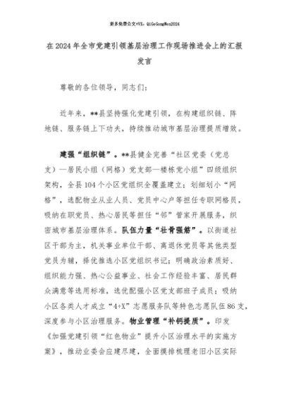 【七哥公文】2024年:在2024年全市党建引领基层治理工作现场推进会上的汇报发言+更多免费公文+VX:QiGeGongWen2024