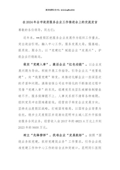 【七哥公文】2024年:在2024年全市政府服务企业工作推进会上的交流发言+更多免费公文+VX:QiGeGongWen2024