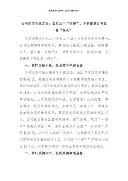 【七哥公文】2024年:公司纪委交流发言:紧盯三个“关键”,不断擦亮日常监督“探头”+更多免费公文+VX:QiGeGongWen2024