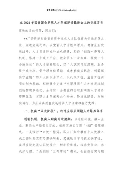 【七哥公文】2024年:在2024年国资国企系统人才队伍建设推进会上的交流发言+更多免费公文+VX:QiGeGongWen2024