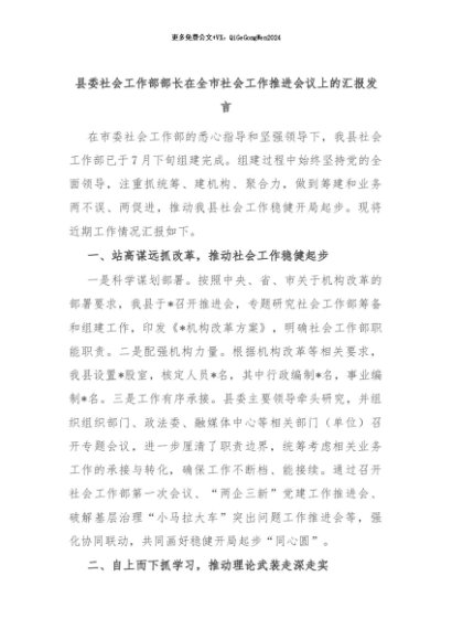 【七哥公文】2024年:县委社会工作部部长在全市社会工作推进会议上的汇报发言+更多免费公文+VX:QiGeGongWen2024
