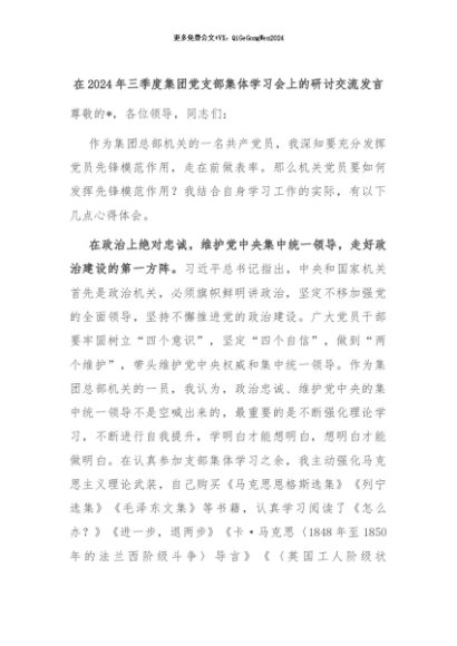 【七哥公文】2024年:在2024年三季度集团党支部集体学习会上的研讨交流发言+更多免费公文+VX:QiGeGongWen2024