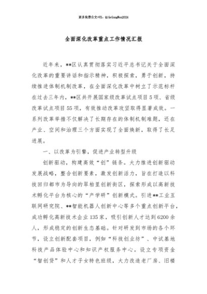 【七哥公文】2024年:全面深化改革重点工作情况汇报+更多免费公文+VX:QiGeGongWen2024