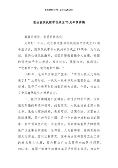 / 【七哥公文】2024年:医生在庆祝新中国成立75周年演讲稿+更多免费公文+VX:QiGeGongWen2024