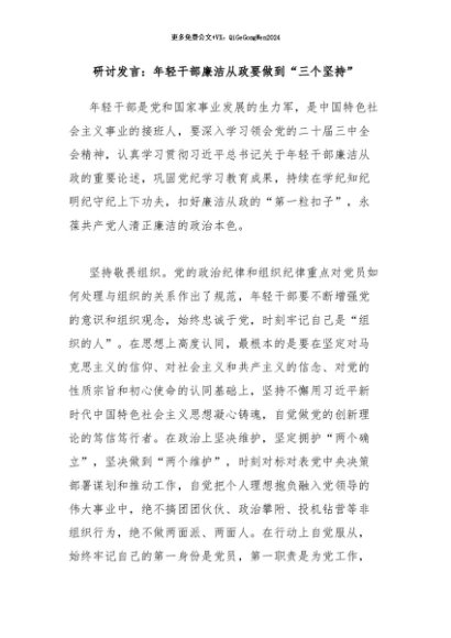 / 【七哥公文】2024年:研讨发言:年轻干部廉洁从政要做到“三个坚持”+更多免费公文+VX:QiGeGongWen2024