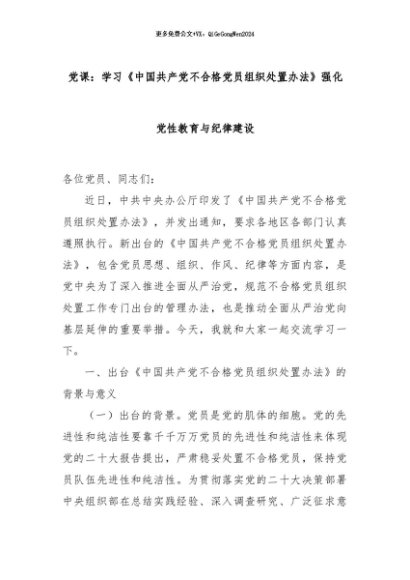 【七哥公文】2024年:党课:学习《中国共产党不合格党员组织处置办法》强化党性教育与纪律建设+更多免费公文+VX:QiGeGongWen2024