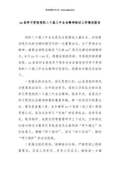 【七哥公文】2024年:xx县学习贯彻党的二十届三中全会精神培训工作情况报告+更多免费公文+VX:QiGeGongWen2024