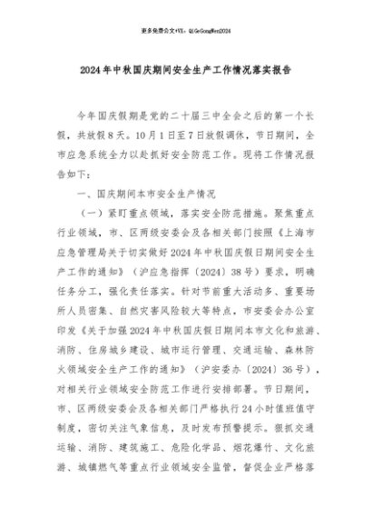 / 【七哥公文】2024年:2024年中秋国庆期间安全生产工作情况落实报告+更多免费公文+VX:QiGeGongWen2024