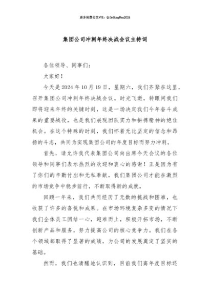 / 【七哥公文】2024年:集团公司冲刺年终决战会议主持词+更多免费公文+VX:QiGeGongWen2024