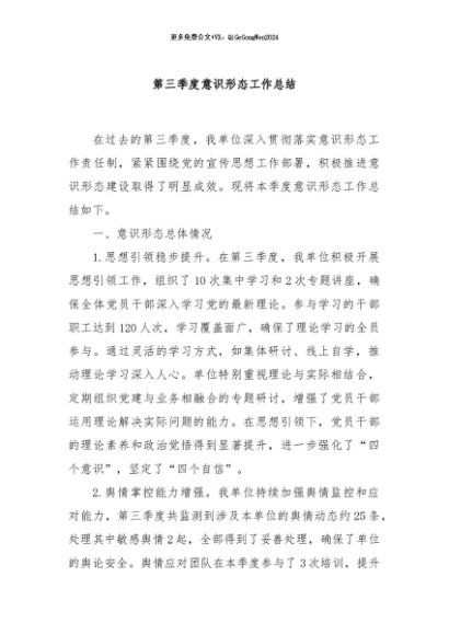 / 【七哥公文】2024年:第三季度意识形态工作总结+更多免费公文+VX:QiGeGongWen2024