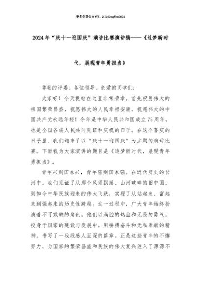 【七哥公文】2024年:2024年“庆十一迎国庆”演讲比赛演讲稿——《追梦新时代,展现青年勇担当》+更多免费公文+VX:QiGeGongWen2024