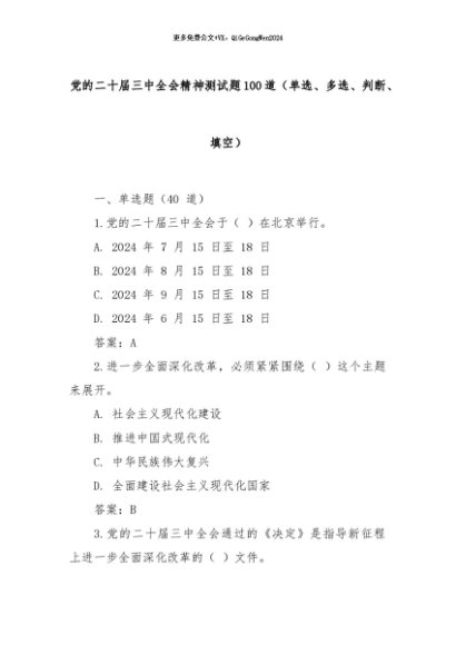 【七哥公文】2024年:党的二十届三中全会精神测试题100道(单选、多选、判断、填空)+更多免费公文+VX:QiGeGongWen2024