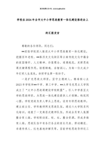 【七哥公文】2024年:学校在2024年全市大中小学思政教育一体化建设推进会上的汇报发言+更多免费公文+VX:QiGeGongWen2024