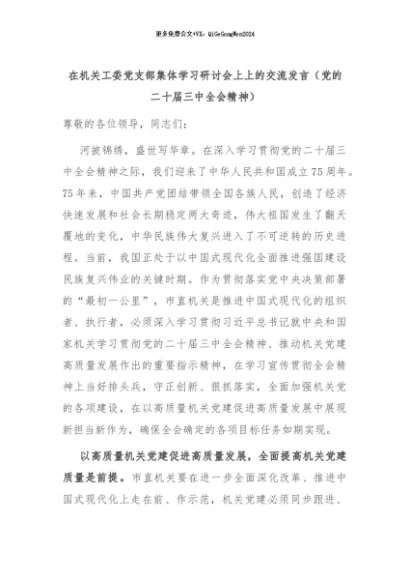 【七哥公文】2024年:在机关工委党支部集体学习研讨会上上的交流发言(党的二十届三中全会精神)+更多免费公文+VX:QiGeGongWen2024