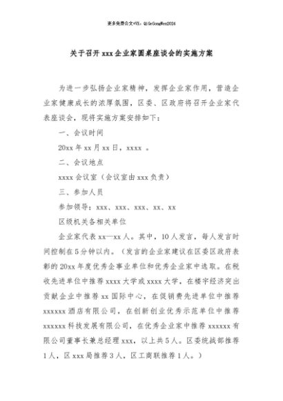 / 【七哥公文】2024年:关于召开xxx企业家圆桌座谈会的实施方案+更多免费公文+VX:QiGeGongWen2024