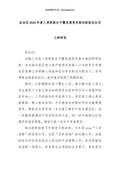 【七哥公文】2024年:在全区2023年度入党积极分子暨发展党员培训班结业仪式上的讲话+更多免费公文+VX:QiGeGongWen2024