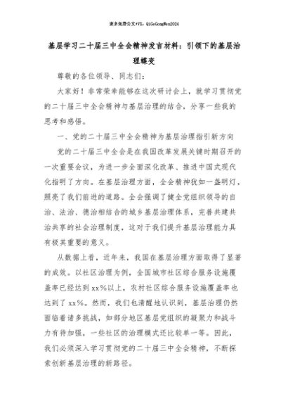 【七哥公文】2024年:基层学习二十届三中全会精神发言材料:引领下的基层治理蝶变+更多免费公文+VX:QiGeGongWen2024