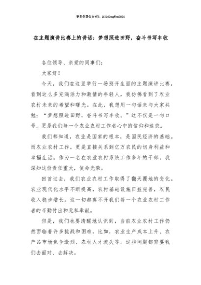 【七哥公文】2024年:在主题演讲比赛上的讲话:梦想照进田野,奋斗书写丰收+更多免费公文+VX:QiGeGongWen2024