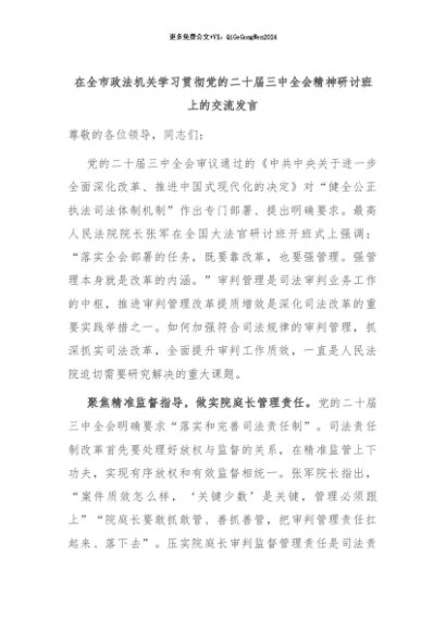 【七哥公文】2024年:在全市政法机关学习贯彻党的二十届三中全会精神研讨班上的交流发言+更多免费公文+VX:QiGeGongWen2024