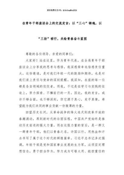 【七哥公文】2024年:在青年干部座谈会上的交流发言:以“三心”铸魂,以“三劲”砺行,共绘青春奋斗蓝图+更多免费公文+VX:QiGeGongWen2024